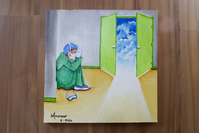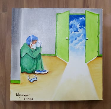A pintura em óleo sobre tela de Amoroso retrata uma enfermeira em um momento de profunda reflexão e serenidade. Ela está ajoelhada ao lado de uma porta aberta que revela um vislumbre dos céus. Nesse cenário celestial, anjos parecem receber as almas daqueles que partiram devido à pandemia. É uma imagem que evoca uma conexão profunda entre a enfermeira e o transcendental, representando a luta e o sacrifício que esses profissionais enfrentaram durante a crise sanitária.