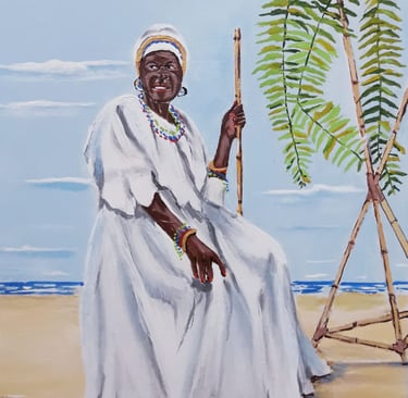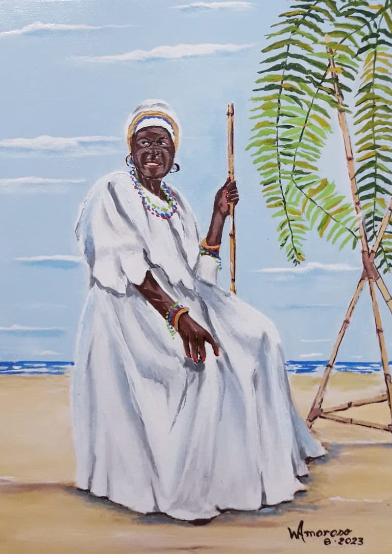 A obra de arte que retrata uma Mãe de Santo mergulha na profundidade de uma espiritualidade rica e ancestral. Sua presença transmite a sabedoria adquirida através de gerações, a ligação com os orixás e a habilidade de curar e aconselhar. É uma homenagem àqueles que mantêm viva a chama da fé, mantendo as tradições africanas vivas em solo brasileiro e cubano.