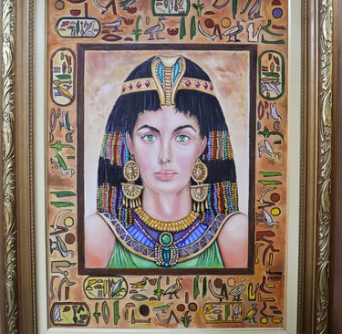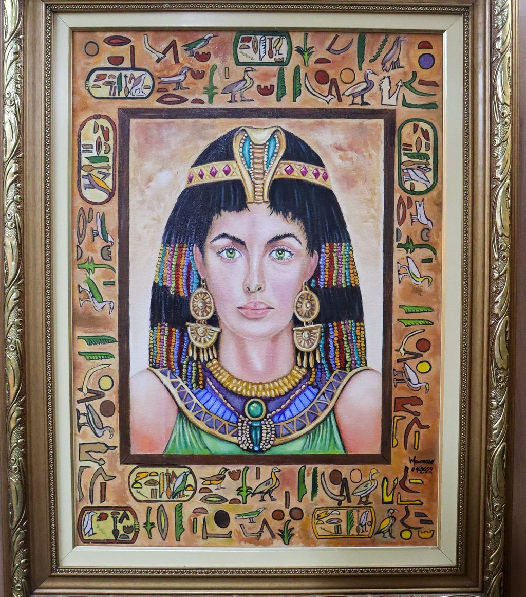 Wladmir Amoroso, mestre da expressão artística, nos transporta para os corredores da história com sua obra notável em óleo sobre tela: "Cleópatra". Esta peça singular é mais do que um simples retrato da rainha egípcia; é uma incursão poética na riqueza da cultura e da elegância de Cleópatra, enriquecida pelas místicas inscrições egípcias que emolduram a composição.