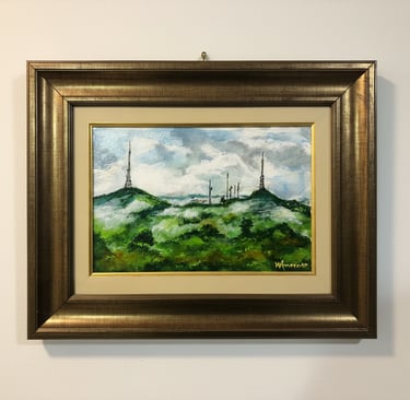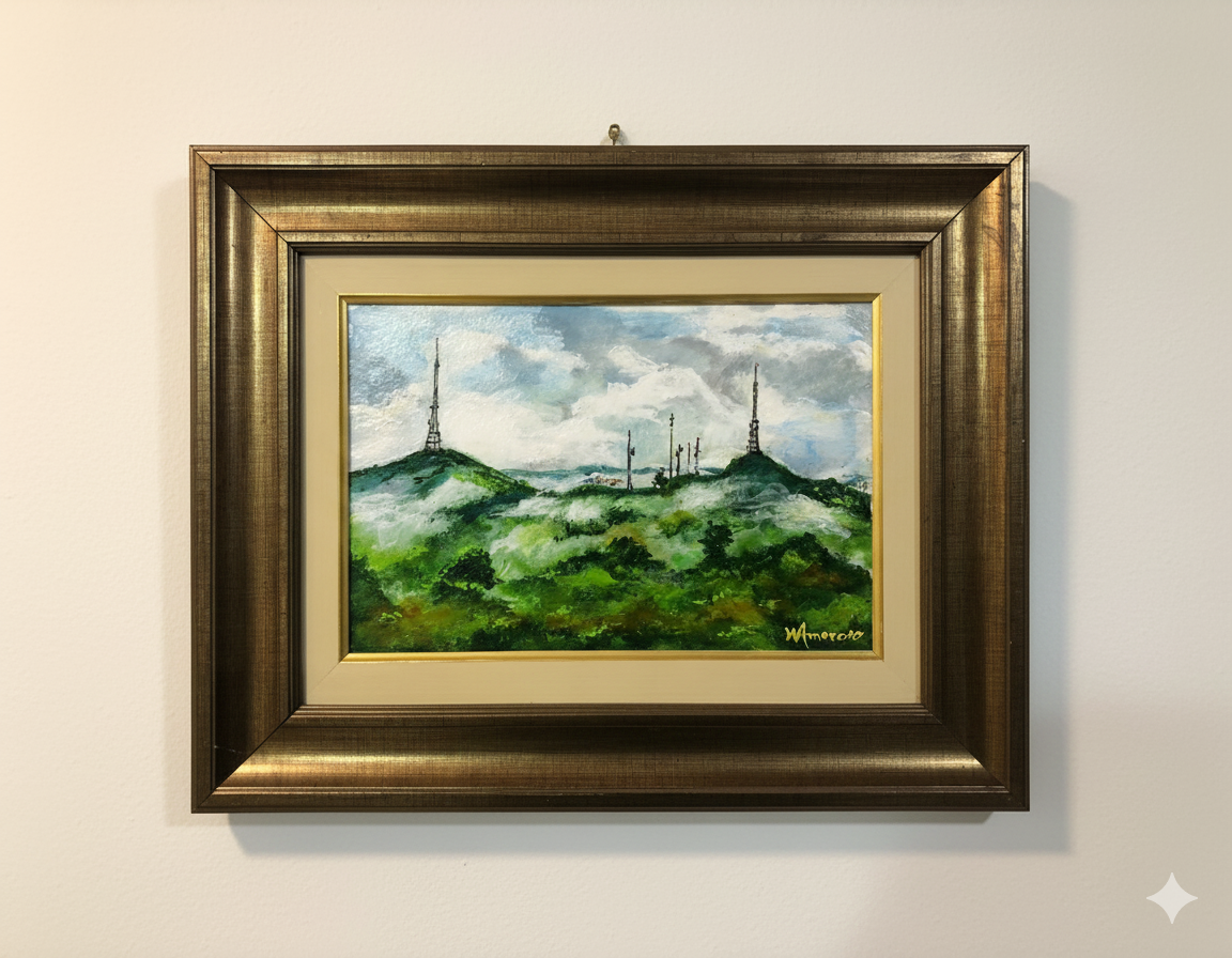 O quadro “Jaraguá”, de Wladmir Amoroso, é uma homenagem poética ao ponto mais alto da cidade de São Paulo. Em tons de verde vibrante e nuances de nuvens esculpidas pelo pincel, o artista retrata o Parque Estadual do Jaraguá, região emblemática coroada por torres de transmissão que cortam o horizonte — um símbolo da convivência entre natureza e modernidade.